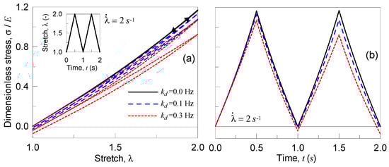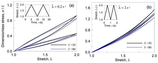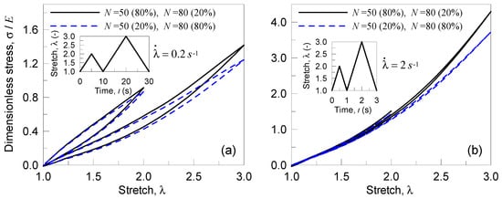 In the second case, we analyze the response of a single network polymer by accounting for the occurrence of damage without any internal rearrangement features (). The CCDF time evolution, , is here evaluated according to Equation (12), while the failure rate function is defined according to Equation (15). The material’s parameters are the following: Elastic modulus , shear modulus , or , and , while the bond energy has been adopted to be , [9], and , . The material is subjected to two deformation cycles with characterized by strain rates equal to and . In Figure 7, the stress-deformation response is illustrated for the two different networks considered and for the two strain rates adopted; it can be noted that the polymer with longer chains () responds more softly, and that in the high strain rate case the damage is lower because of the short time available to the chains to break during the deformation process (Figure 8b).