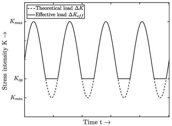 A further modification of the KTD is given by the implementation of the crack resistance curve (R-Curve), as introduced by Chapetti in [42]. The cyclic R-curve characterizes the resistance of the material to crack initiation, respectively propagation. Therefore, the crack resistance rises from the intrinsic threshold to the long crack threshold with elevating crack length due to crack closure effects [43]. Crack closure effects lead to premature physical contact of the crack shoulders, such that the original load range is reduced to an effective one —see Figure 1.