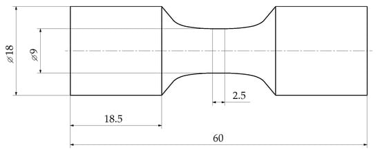The microstructural properties in terms of the dendrite arm spacing (DAS) are evaluated by a procedure proposed in [72], since the DAS correlates well with both quasi-static [73,74,75] and fatigue properties [76,77] due to its dependency with inter-dendritic shrinkage pore sizes [57]. The investigations of the DAS reveal a minor deviation of just five percent between sampling position A and B, such that technological size effects are negligible at these two positions. Thus, differently sized specimens can be taken from these two positions to evaluate the statistical size effects. Furthermore, the specimens have been designed by numerical shape optimization of the fillet region, such that a minor stress concentration factor of just 1.02 is not exceeded. This enables a variation of the highly-stressed volume by scaling the length of the constant specimen diameter, where the general shape of the specimen is kept similar. The high cycle fatigue (HCF) specimen geometry type A and B are displayed in Figure 2 and Figure 3, respectively. As depicted in Figure 3, the length of the constant testing diameter of specimen B is significantly enhanced by a factor of 18 with respect to specimen geometry A, to force a significant statistical size effect. Subsequently, the two specimen types are only labelled in relation to their different geometry as A, small-sized reference sample, and B, enhanced highly-stressed volume size.