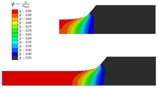 The highly-stressed volume is furthermore numerically evaluated. In line with the subsequent testing procedure, the linear-elastic finite element analysis is conducted with an unified uni-axial tension load. Hereby, the numerical model is set up invoking eight node axisymmetric CAX8R elements. In Figure 4, the results of the numerical analysis are depicted, showing the normalized maximum principle stress.