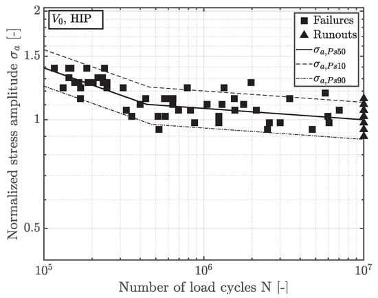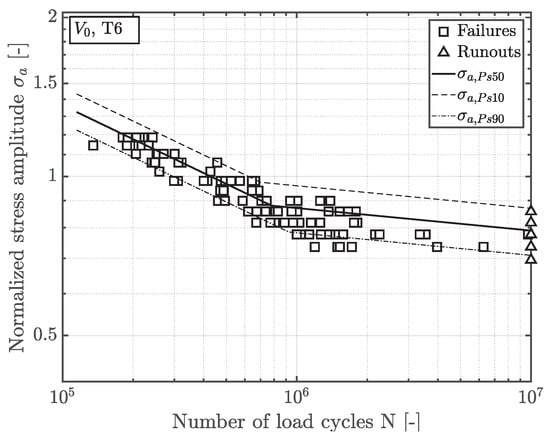 The fatigue strength of both specimens is evaluated at the same resonant testing machine, utilizing a testing frequency of just beneath 120 Hz and fully reversed/tension compression loading. The run out number was preliminarily defined to be ten million cycles in order to ensure a statistically assessed long life fatigue strength. As proposed in prior studies [78] and applied in [4,70], the slope of the S/N-curve in the long life region is considered to scale with the slope in the finite life , such that —see [78]. The evaluation of failures in the finite life region is conducted by the statistical procedure given in the standard [79]. The long life fatigue strength is assessed by means of the arcsin methodology—see [80].