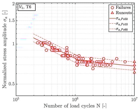 The statistically evaluated S/N-curve of position A, inheriting a highly-stressed volume , is depicted in Figure 6, along with the 90 and 10 percent scatter band. All fatigue data is normalized by the fatigue strength of the near defect free material of position A. Thus, the long life fatigue strength decrease by about in the presence of shrinkage pores. Since the highly-stressed volume of position B is majorly enhanced, its fatigue strength reveals a significant statistical size effect in terms of an additional decrease in fatigue strength by approximately fifteen percent—see Figure 7.