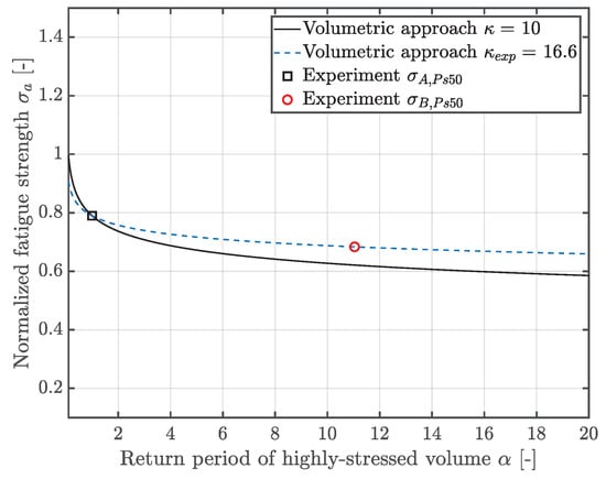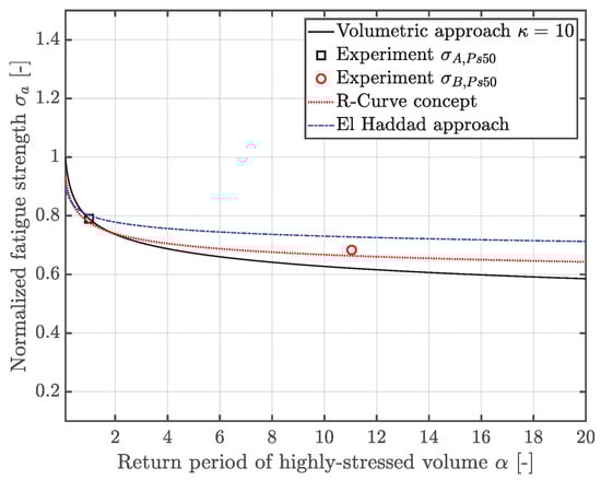 On the other hand, the presented approach in this work, considering the theoretical statistical distribution of flaw sizes in an arbitrary enhanced volume , reveals a sound correlation with the fatigue data of both geometries A and B with a slightly conservative estimation of the fatigue strength—see Table 4. Finally, a graphical illustration is given in Figure 16. Thus, the fatigue strength of larger components, inheriting an elevated highly-stressed volume, can be properly calculated by the presented model in this work, especially when crack closure effects are considered by means of the implemented R-curve approach.