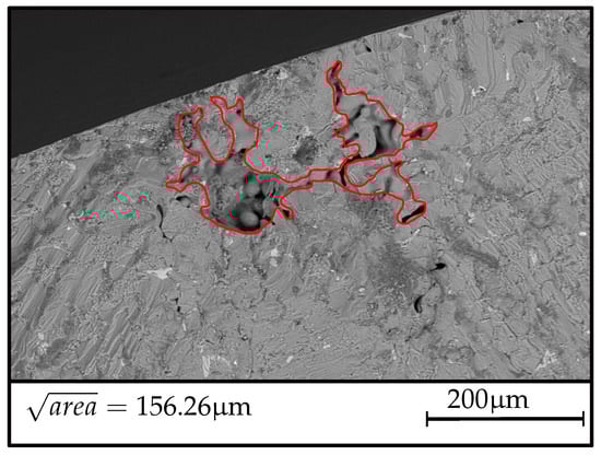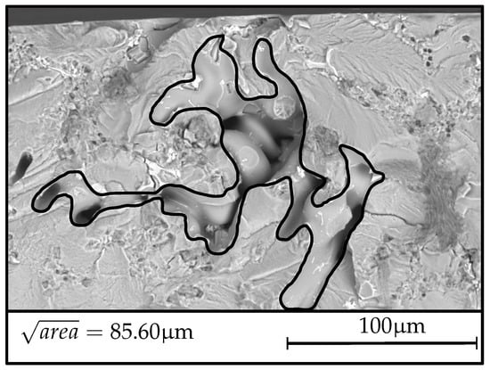 Figure 9 displays the fatigue fracture surface of a representative specimen of position A, revealing an equivalent crack size of just over 85 m. Accordingly, Figure 10 depicts a fracture surface and the critical defect as the very point of crack initiation at geometry B. The evaluated critical defect size displayed in Figure 10 is significantly enhanced with respect to average inhomogeneity sizes in position A, in line with the general presumption of the statistical size effect. Hence, the evaluated decrease in terms of fatigue strength of position B is caused by the elevated spatial extent of pre-existent microcracks respectively micro shrinkage pores.