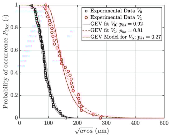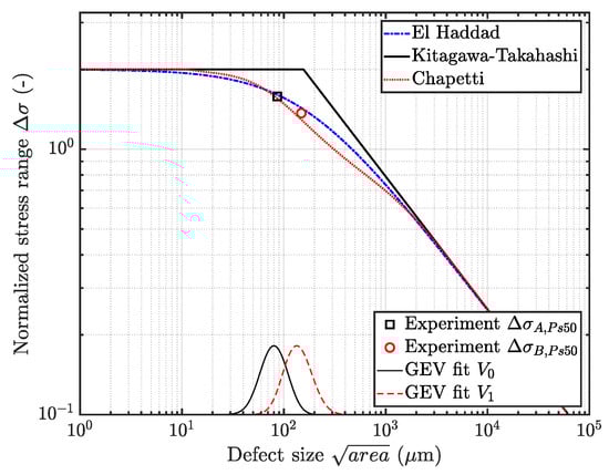 Finally, the derived model for the generalized extreme value distribution in a volume is displayed in Figure 11. As proposed by the numerical investigation of the highly-stressed volumes in each specimen geometry, the factor is defined to possess a value of ten. As depicted, the critical defect sizes in geometry B have minor deviation with respect to the theoretical distribution of , which is caused by variations of fatigue fracture initiating micropore sizes due to the invoked measurement methodology.