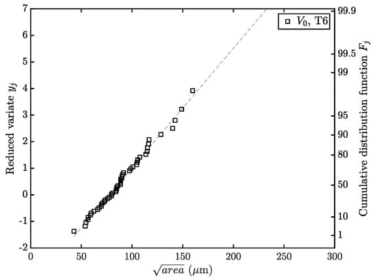 Hereby, the very fatigue fracture initiating defect sizes of every specimen are sorted and indexed with . Subsequently, the cumulative probability can be derived for each sample j invoking Equation (10). Accordingly, a reduced variate can be estimated, as depicted in Equation (11):