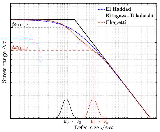 with Y being the geometry factor, taking the defect size, shape and location into account—see [38]. A qualitative study on the influence of the defect orientation and location on the stress concentration factor is given in [39]. The original Kitagawa–Takahashi diagram KTD was later modified by El Haddad in [40,41], such that the fatigue strength steadily decreases with elevating defect sizes a.