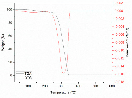 TG was performed, in order to characterize DmiBr, as well as pure and DmiBr-modified fillers. Based on the obtained weight losses for pure and DmiBr-modified fillers, the amount of DmiBr grafted on the filler surface was determined and used to calculate the efficiency of filler modification. The results are presented in Figure 1, Figure 2, Figure 3, Figure 4 and Figure 5 and summarized in Table 1. To confirm the presence of DmiBr in modified fillers and to predict the mechanism of ionic liquid thermal decomposition, TG coupled with gas analysis (TG-MS) was carried out (Table 2 and Table 4).