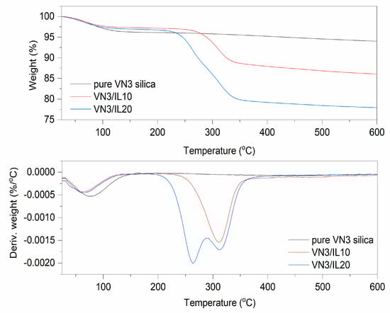 On the TG curve corresponding to the thermal decomposition of pure VN3 silica, weight loss of approximately 3.7% occurred at a temperature below 150 °C (Figure 2). This was due to the desorption of moisture, as silica is a highly hygroscopic powder. The next weight loss obtained for this filler was approximately 2.2% in the temperature range of 350–600 °C and resulted from dehydroxylation of the silica surface [56]. In the TG curve corresponding to the thermal decomposition of VN3/IL10 powder, a weight loss of approximately 5.3%, at a temperature below 150 °C was observed, which was slightly higher than that of pure silica. This may result from desorption of moisture together with solvent, which remained in this powder after silica modification with DmiBr. The weight loss of approximately 10.7% in the temperature range of 150–550 °C was associated with thermal decomposition of the ionic liquid, as was confirmed by MS analysis of the evolved gases (Table 3). Mass/charge ratios, characteristic of DmiBr decomposition, were identified in the MS spectra of VN3/IL10 in this temperature range and confirmed the presence of DmiBr in modified powder. Apart from the m/z ratios presented in Table 2, additional bands in mass spectra of DmiBr-modified fillers were achieved for the m/z assigned to ions from decomposition of DmiBr: 29-C2H5+, 31-CH3NH2+, 44-CO2, 72-C3H7CHNH2+) [55] (Table 3).