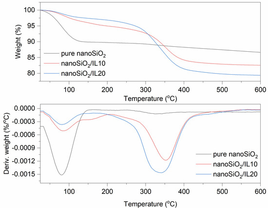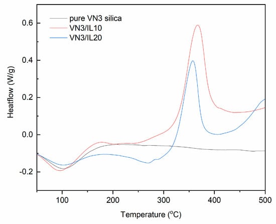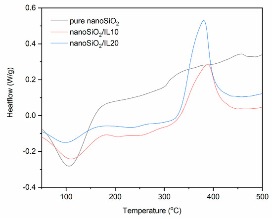 Similar thermal behavior was observed for DmiBr-modified nanoSiO2 (Figure 8). Desorption of moisture, accompanied by desorption of solvent for modified powders, occurred in the temperature range of 52–162 °C (pure nanoSiO2), 56–111 °C (nanoSiO2/IL10), and 49–155 °C (nanoSiO2/IL20). The process of DmiBr desorption from the surface of modified filler, accompanied with its partial decomposition, started at 187 °C for nanoSiO2/IL10 and 196 °C for nanoSiO2/IL20, i.e., at a lower temperature than that of VN3 silica. Next, an exothermic peak of DmiBr thermal decomposition appeared above 330 °C. Regarding the range of commonly used vulcanization temperatures 140–180 °C, DmiBr-modified nanoSiO2 should also be stable during processing of rubber compounds.
