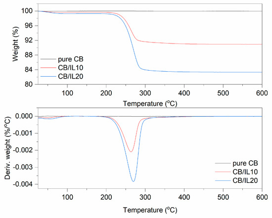 In TG curves corresponding to the thermal decomposition of CB/IL10 and CB/IL20 fillers, a small weight loss at a temperature below 100 °C occurred, approximately 0.3% for CB/IL10 and 0.7% for CB/IL20 (Figure 4). This may result from the desorption of solvent, which remained in the powder after its modification with DmiBr. The weight losses of approximately 8.8% (CB/IL10) and 16.1% (CB/IL20) in the temperature range of 150–550 °C were associated with thermal decomposition of DmiBr. The weight loss observed in this temperature range for pure CB was about 0.2, so the content of ionic liquid on the CB surface was calculated as 8.6% and 15.9% for CB/IL10, and CB/IL20, respectively. Therefore, the efficiency of CB modification with DmiBr was 86% (CB/IL10) and 80% (CB/IL20) (Table 3). The presence of ionic liquid in modified CB powders was confirmed by MS spectra with characteristic m/z ratios for thermal decomposition of DmiBr (Table 4).