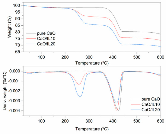 The last filler modified with DmiBr was nanosized CaO. On the TG curve corresponding to the thermal decomposition of pure CaO, the first weight loss (1.5%) at a temperature below 150 °C could be observed (Figure 5). It resulted from desorption of moisture; CaO is a hygroscopic powder often used in rubber compounds to absorb moisture. According to MS analysis (Table 4), the next weight loss (20%) in the temperature range of 350–600 °C was accompanied by the release of CO2, likely due to the thermal decomposition of precursors used for synthesis of nanosized CaO, such as calcium carbonate or calcium hydroxycarbonate. Moreover, CaO can absorb CO2, which is released when heating above the temperature 400 °C [57]. In TG curves corresponding to thermal decomposition of CaO/IL10, three steps were shown. The first at a temperature below 200 °C with a weight loss of 1.6% may result from desorption of moisture or solvent, which remained in the modified powder after modification with DmiBr. The second step of decomposition proceeded in the temperature range of 200–350 °C with a weight loss 6.7%. Such weight loss was not observed in the TG curve of pure CaO, so it corresponds to the decomposition of DmiBr. Moreover, MS spectra showed m/z ratios characteristic for ionic liquid decomposition. The next weight loss of about 17.7%, in the temperature range of 350–600 °C, was associated with thermal decomposition of precursors used for synthesis of nanosized CaO and was accompanied by the release of CO2 as was confirmed by MS analysis (m/z 44). In the case of CaO/IL20, similar thermal decomposition was achieved. The weight loss in the temperature below 200 °C (approximately 1.9%) was due to desorption of moisture and solvent after the modification process. The second weight loss in the temperature range of 200–350 °C (12.7%) resulted from the decomposition of DmiBr, whereas the weight loss in the last step of approximately 16.4%, in the temperature range of 350–600 °C, corresponded to thermal decomposition of synthesis precursors, with a release of CO2 as confirmed by MS analysis [57]. The efficiency of CaO modification with DmiBr calculated, based on the proper weight losses was 67% (CaO/IL10) and 64% (CaO/IL20), and thus the lowest of all studied fillers. Therefore, it can be concluded that the surface of nanosized CaO exhibited the lowest reactivity with DmiBr. This may be a result of the high content of CaO synthesis precursors that act as impurities reducing the reactivity of the functional groups present on the surface of this filler or reducing their availability to interaction with DmiBr.