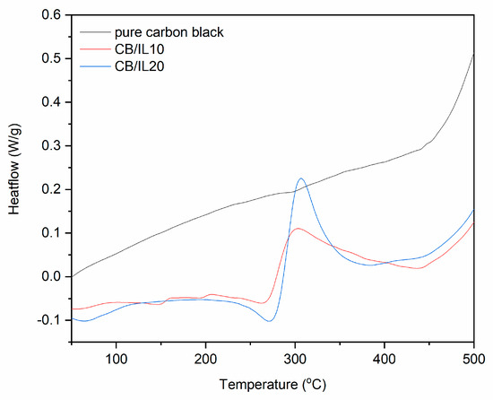 On the DSC curve of CB/IL10, a broad endothermic peak at a temperature range of 29–87 °C can be observed (Figure 9) most likely as a result of inaccurate evaporation of the solvent and corresponding to the first weight loss on the TG curve presented earlier. Next, the endothermic process could be seen from 220 to 275 °C, which was associated with desorption of DmiBr and beginning of its thermal decomposition, as was confirmed by TG-MS analysis. However, in the case of CB ionic liquid should also not desorb from the surface of filler during elastomer vulcanization. After desorption, DmiBr decomposed in the temperature range of 276–384 °C. Similar thermal effects were achieved for CB/IL20. Desorption of DmiBr from the CB surface with the beginning of its decomposition proceeded in a temperature range similar to the VN3 silica.