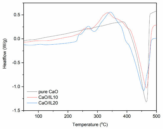 Regarding the DSC curve for pure nanosized CaO, no thermal effects were observed in the temperature range of 25–400 °C, whereas at a higher temperature, an endothermic peak appeared corresponding to the last weight loss on the TG curve (Figure 10). Therefore, it was concluded that this is a thermal decomposition of CaO precursors, which remained after synthesis of this filler. Similar peaks were achieved for DmiBr-modified CaO. A wide endothermic peak in the temperature range of 35–260 °C occurred for CaO/IL10. This may be due to desorption of solvent after modification accompanied by desorption of DmiBr. Therefore, it could be expected that DmiBr will desorb from the CaO surface during vulcanization of rubber compounds. After desorption, ionic liquid decomposed in the temperature range of 290–402 °C. The same thermal effects were observed for CaO/IL20. The first endothermic peak was in the temperature range of 33–259 °C. The heat of the first peak for CaO/IL20 (37 kJ/mole IL) was almost twice as large as for CaO/IL10 (22 kJ/mole IL), which may confirm the assumption that this peak corresponded to the desorption of DmiBr from the CaO surface. After desorption, DmiBr decomposed exothermically in the temperature range of 296–387 °C. It should be noted that in the case of CaO, desorption of DmiBr proceeded in the lowest temperature in comparison with the other fillers. This confirmed the lowest reactivity of CaO with DmiBr and weak interaction with this ionic liquid.