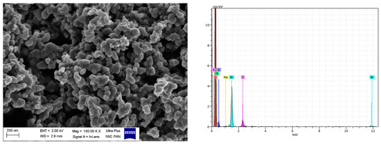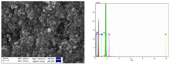 SEM images were taken to study the particle morphology and size of DmiBr-modified fillers. Additionally, EDS analysis was employed to confirm the presence of DmiBr on their surface. The exemplary results for pure fillers and modified with 20 wt.% of DmiBr are presented in Figure 11, Figure 12, Figure 13, Figure 14, Figure 15 and Figure 16 and summarized in Table 7.