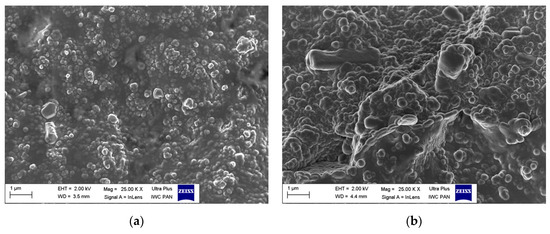 To study the behavior of DmiBr-modified fillers in the rubber matrix, SEM images were taken for the fractures of vulcanizates based on ethylene-propylene-diene elastomer (EPDM). SEM images for vulcanizates, containing VN3/IL20 and CB/IL20 are presented as examples (Figure 17). It can be seen that the particles of DmiBr-modified fillers were quite homogeneously dispersed in the elastomer matrix and exhibited good adhesion to the elastomer.