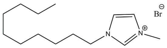 Thermal decomposition of DmiBr involved two steps. The first weight loss of approximately 3.5%, in the temperature range of 50–180 °C, was likely associated with a partial desorption of moisture, whereas the main thermal decomposition of DmiBr proceeded in the temperature range of 180–400 °C with a weight loss of 96.1%. It started with the decomposition of the dodecyl chain of DmiBr into short CxHy+ (e.g., m/z 12, 13, 14, 15, 26, 27, 41, 42, 43, 56) fragments accompanied by the departure of bromide anion (m/z 79–81) and decomposition of the imidazolium ring of ionic liquid into different CxHyNz+ fragments, as was confirmed by TG-MS analysis (e.g., m/z 51, 52, 55, 56) (Table 2) [55]. The structural formula of DmiBr (Schema 1) was taken into account to predict the course of DmiBr thermal decomposition.