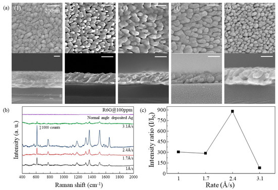 (a) Top view(upper) and cross-section(below) SEM images of (1) normally deposited Ag film and (2–5) Ag nanorods arrays deposited at different rates of 1, 1.7, 2.4, and 3.1 Å/s, respectively. Si/SiO2 was used for the substrate. (b) SERS spectra of R6G absorbed on Ag in (a). (c) SERS efficiency of each Ag substrate.