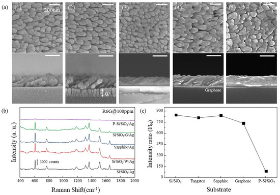 (a) Top view(upper) and cross-section(below) SEM images of Ag nanorods arrays deposited on different substrates at 2.4 Å/s of deposition rate. (1) Si/SiO2, (2) Si/SiO2/W, (3) Sapphire, (4) Si/SiO2/G, and (5) P-Si/SiO2. (b) SERS spectra of R6G absorbed on Ag in (a). (c) SERS efficiency of each Ag substrate.