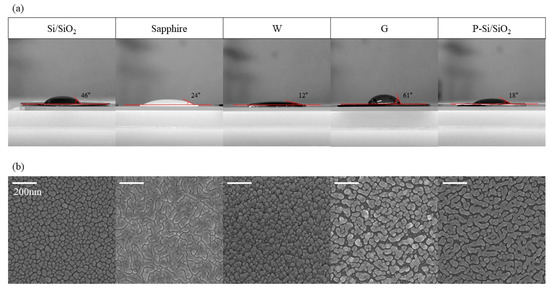 The contact angle of each substrate was measured to find out the cause of the change in growth characteristics of the Ag rods according to the substrate. Figure 5a is the contact angle images of water droplets on each substrate. The contact angle was 46° for Si/SiO2, 24° for sapphire, 12° for tungsten, 61° for graphene and 18° for P-Si/SiO2. Figure 5b are SEM images of Ag deposited in a thickness of 30 nm with oblique angle-deposition. For Si/SiO2, Ag was deposited like a nanodot. For W, although it showed the lowest contact angle, Ag was deposited in a nanodot shape similar to that of Si/SiO2. This is because when Ag nuclei are formed on W, Ag atoms are preferentially adsorbed on Ag nuclei rather than W surface [32]. In sapphire and P-Si/SiO2 which have lower contact angles than Si/SiO2, Ag was deposited as wide as a film. In the case of sapphire, since a complete Ag film is formed, when Ag is deposited thereon, Ag nuclei are formed and undergo nanorod-like growth when deposited on a new substrate. On the other hand, on P-Si/SiO2, which has a high coverage but not a complete film, the adsorption of Ag occurs only on the Ag islands because the shadow regions are formed due to the already deposited Ag islands. Since the coverage of these islands is very high at this time, Ag is eventually deposited closer to the film than the nanorods arrays. In the case of G, which has the highest contact angle, Ag islands are deposited in very low coverage. Because of the low wettability of graphene, Ag nuclei are not produced much, and growth of the generated nuclei mainly occurs. The nuclei grow to become islands and Ag deposited on the island eventually form a wave-like structure.