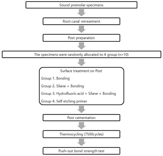 The specimens were sectioned horizontally into 1 mm thick slices by using a low-speed diamond saw (Met-Saw; R&B Co Ltd.) Each coronal and apical part was analyzed to evaluate the push-out bond strength. The push-out bond strength was tested by a universal testing machine (EZ-S; Shimadzu Scientific Instruments, Kyoto, Japan). The test was performed by directing the load from the apical to the coronal direction at a cross-head of 0.5 mm/s until bond failure occurred. The bonding force value (N) of each section was divided by post-dentin surface area to calculate the push-out bond strength value (MPa). The method of calculating the bond surface area has been described in previous studies [,]. A schematic flow of the entire process is shown in Figure 1.