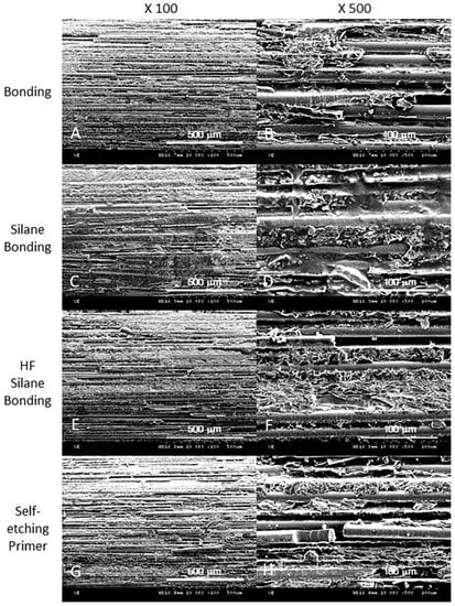 SEM image of the surface of all groups: A and B, dentin bonding group 1; C and D, group 2, silane + dentin bonding treated group; E and F, group 3, HF + silane + dentin bonding treated group; G and H, group 4, self-etching primer treated group.
