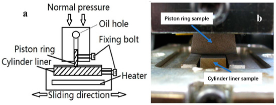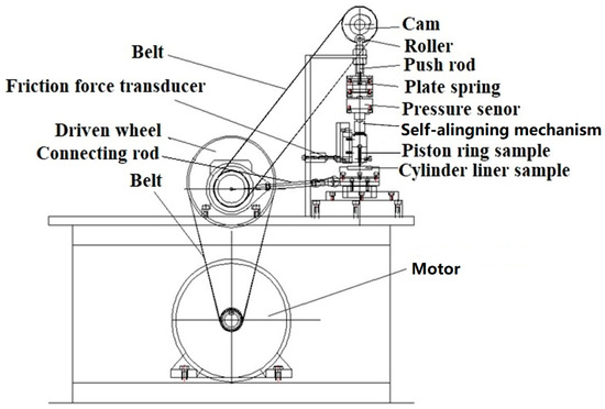 Figure 1. The driving force generated from the motor rotates the crank through the reduction gear, and then the crank-connecting rod mechanism transforms rotary motion into reciprocating motion of the cylinder liner sample. Meanwhile, the driven wheel drives the cam to rotate through the belt. A cam-roller loading mechanism through the plate spring is applied to exert shock loading on the dead center interface between moving parts (cylinder liner sample) and fixed parts (piston ring sample). This mechanism can simulate a combination of combustion-level pressures and the resulting impacts to the PRCL interface. The self-aligning mechanism between pressure sensor and piston ring sample could evenly transmit the nominal pressure across the ring/liner in the circumferential direction. When the piston ring sample and cylinder liner sample had the relative sliding motion, a piezoelectric force transducer mounted behind the piston ring fixture was subjected to a tension–compression action, allowing the friction force to be recorded online in the experiment. The test rig can accommodate a wide range of nominal pressures (5 MPa–200 MPa), displacement frequencies (1 Hz–40 Hz), and temperatures (25 °C–300 °C) at the PRCL interface. Lubricating oil was applied to the interface through a peristaltic pump at the dosage of 0.1 mL/min. The oil was evenly distributed along the entire 30-mm stroke.