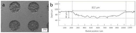 Figure 3 shows the surface topography of the micro-dimpled cylinder liner and a two-dimensional (2D) profile of a single micro-dimple. It presents a regular shape with the parameters of ~822 μm in diameter and ~44 μm in depth. Compared with the laser texturing technology, REJP machining technology without high-temperature evaporation can retain the graphite sheets in micro-dimpled textures. These graphite sheets are helpful to form the solid lubrication at the contact area [
