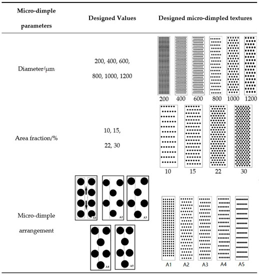35], the designed micro-dimple parameters on the cast-iron cylinder liner which probably affect the scuffing resistance behavior, including micro-dimple diameter, area fraction, and micro-dimple arrangement, are shown in