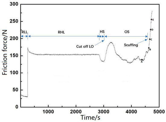 The running-in and starved lubrication experiment was divided into four stages: the running-in stage with the light load (RLL), the running-in stage with the heavy load (RHL), the heating stage (HS), and the oil starvation stage (OS). The running-in stage was supplied with adequate lubricating oil at the dosage of 0.1 mL/min. The oil was evenly distributed along the entire 30-mm stroke. The maximum nominal pressure of 50 MPa corresponds to a maximum normal force of 1280 N at the shocking dead center. The RLL was to eliminate large burrs. The RHL was used to form a relatively stable contact state on the PRCL interface; then, the HS was applied to accelerate the simulation process of the cylinder scuffing and improve the test efficiency. The OS was to stop the lubricating oil (LO) supply and form the starved lubrication condition at the PRCL interface. The experimental conditions are shown in