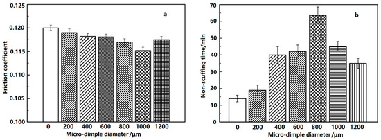 Figure 8b, the non-scuffing time of non-dimpled cylinder liner showed shorter non-scuffing duration than that of the micro-dimpled cylinder liner, indicating that the existence of the micro-dimple arrays on the cylinder surface is beneficial for improving the scuffing resistance of the PRCL as well. For the micro-dimpled textures with different diameters, the variation of non-scuffing time firstly increased and then decreased with the designed micro-dimple diameter increasing from 200 μm to 1200 μm. Unlike the friction coefficient, the longest non-scuffing time was found at the designed micro-dimple diameter of 800 μm, and was about 4.5 times longer than that of the non-dimpled cylinder liner.