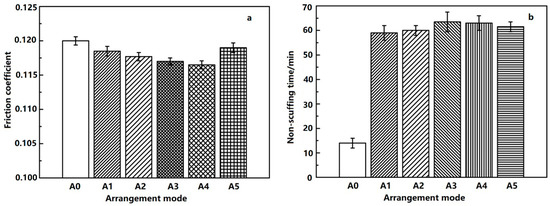 The friction coefficient and the non-scuffing time of non-dimpled cylinder liner (A0) was also not better than that of the micro-dimpled cylinder liner. The friction coefficient firstly decreased and then increased with the dimple arrangement varying from A1 to A5. When the dimple arrangement was A4, the friction coefficient was the smallest. For the micro-dimpled textures with different arrangements, the non-scuffing time of intersect arrangement (A3, A4, A5) was better than the separated (A1) and tangential arrangements (A2). The variation of non-scuffing time between A3 and A4 presented a little difference, but A3 was slightly longer than A4.