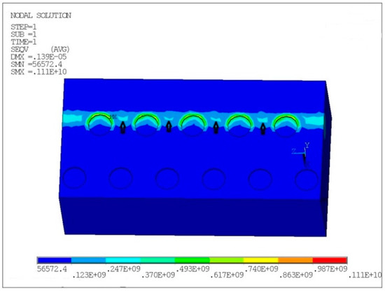 Figure 11 presents the contact stress distribution of the micro-dimpled cylinder liner in units of Pa. It was found that the existence of the micro-dimpled textures led to two types of contact stress concentration regions. One of the stress concentration regions was at the edge of the micro-dimple, while the other region was located at the connections between adjacent micro-dimples (black arrow). Compared with other regions, the surface damage would most likely initiate at the stress concentration regions during sliding.