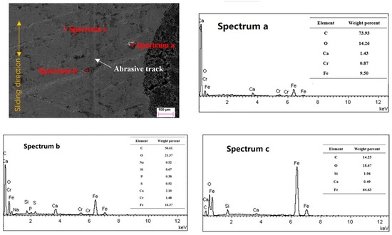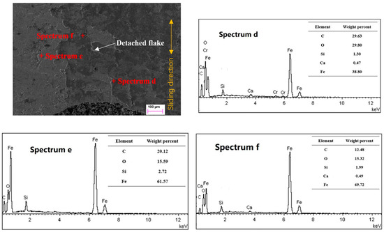 Figure 6 before scuffing. It can be seen that the honing surface of the cylinder liner was plastically deformed, and almost detached flakes existed in some areas. All the detected positions d, e, and f did not contain the Cr element from the piston ring. Based on the comparison of elements, spectrum d showed much more C element than spectrum e and spectrum f. It also indicates that the closer it is to the micro-dimple, the more C element exists. The graphite sheet from the micro-dimple may supply the graphite solid lubricant to the vicinity region under the reciprocated sliding motion.