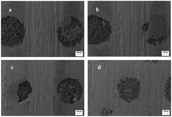 Figure 14a. There was a marked groove along the sliding direction between the adjacent micro-dimples, but the micro-dimpled region presented a slight damage state. One of the micro-dimples was filled with some agglomerated materials. It indicates that the matrix material of the cylinder liner was rolled into the micro-dimple after plastic deformation. As the adhesive wear became serious, the abrasive particles gradually filled into the whole micro-dimple, as illustrated in