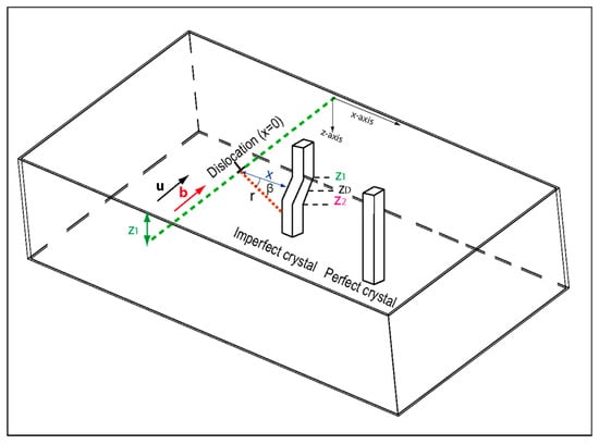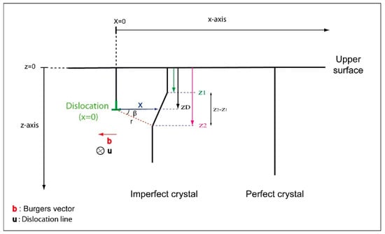 Figure 1 shows a dislocation parallel to the surface of a bulk sample and located at a depth zD. This defect is characterized by a Burgers vector and a line direction . At a distance x away from the dislocation core (in , the crystal plane is deformed. The displacement field is then defined in polar coordinate () as follows []: