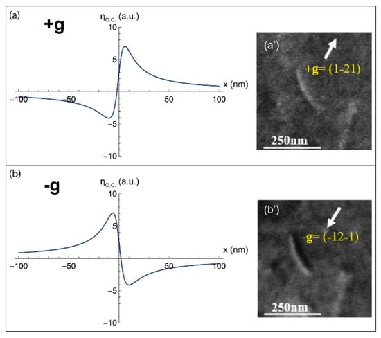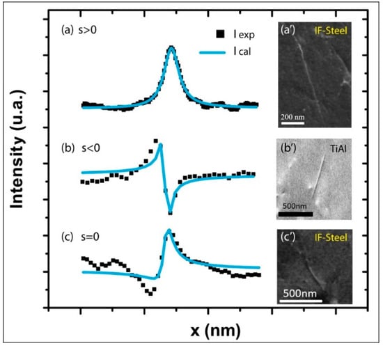 The theoretical intensity profiles calculated from Equation (8), in the case of a screw dislocation, for the diffraction conditions and are represented in Figure 2. Their corresponding experimental ECC micrographs are also shown (Figure 2a’,b’). The g and s vectors are, respectively, determined experimentally through the pseudo-band indexation of the High Resolution Selected Area Channeling Pattern (HR-SACP) assisted by Electron BackScatter Diffraction (EBSD) experiment [,].