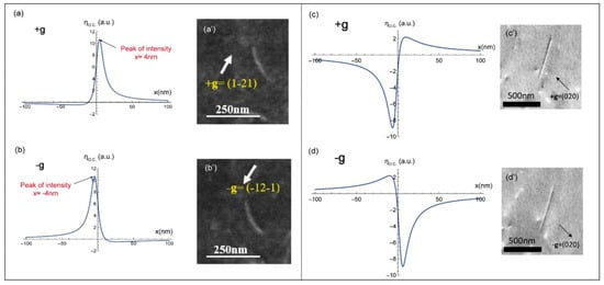 For both and diffractions, the dislocation profiles (Figure 2a,b) are anti-symmetric: a hollow and a peak corresponding to the black and white sides of the dislocation, respectively (Figure 2a’,b’). Moreover, in the case of , the extrema are inverted compared to those observed for : the peak becomes hollow and vice versa.