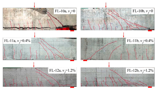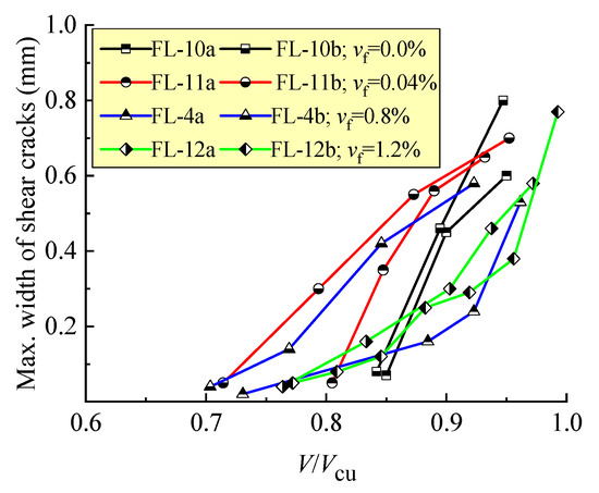 As displayed in Figure 3, without steel fibers, the shear crack of the FL-10a and FL-10b beams initially appeared at a high loading level of V/Vcu about 85%, and rapidly extended to be a larger width than the control. When the steel fiber vf = 0.4%, the status on FL-11a and FL-11b beams tended to be improved, but the discreteness of V/Vcu at the same maximum width of shear crack was higher in these two beams. With a further increase in vf, the confinement effect of the steel fibers on crack extension became more efficient, the shear crack appeared initially at a relative lower loading level V/Vcu below 77%, the main crack width opened continuously under the increasing load, and an obvious increment took place at a high loading level V/Vcu. This result suggests a certain ductility of the shear failure of the beams.