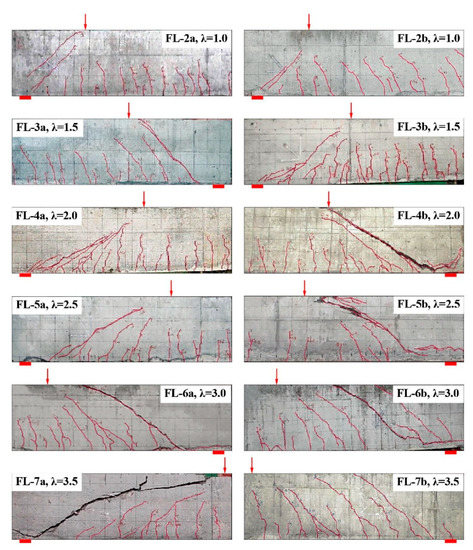 Figure 4 presents the crack distribution of the test beams with a different shear-span to depth ratio λ. When λ = 1.0, two main inclined cracks appeared at the shear-span of the FL-2a and FL-2b beams with small widths during the loading process, and the inclined compression failure finally turned up with the characteristics of a crushed SFRELC at the top part of the inclined band formed between these two main inclined cracks. When 1.5 ≤ λ ≤ 2.5, the web shear cracks turned initially and extended to the supports and loading points along the inclined direction, and one of them developed as the main shear crack with the increasing load. The shear compression characteristics developed clearly with the crushed SFRELC in the shear compression zone accompanied by the shear cracks in the larger width within the tensile zone. When λ = 3.0 and 3.5, several shear cracks appeared almost parallel in the shear-span; one of them near the support quickly developed upward and downward to be the main inclined crack, and then the inclined tensile failure took place with the characteristics of two parts separated at the shear-span. If the load was exerted sequentially, the tearing crack of the SFRELC along the longitudinal rebars turned up on beams FL-6b and FL-7a with a loud sound. Generally, the shear crack distribution and failure mode of the test beams were mostly controlled by the shear-span to depth ratio, while the failure procedure was successive due to the confinement of the steel fibers.
