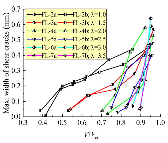 In view of the test beams with varying λ, the changes of maximum width of shear cracks with the loading level V/Vcu are exhibited in Figure 5. This figure indicates the direct relationship between the shear crack opening and failure modes of the test beams. With the increase of λ, the loading level V/Vcu increased when the initial shear crack appeared, the extending of the main crack became fast under the increasing loads, and the failure tended to be abrupt. When λ ≤ 2.5, the process of the shear crack opening was persistent with the increase of the loading level V/Vcu; an ominous sign of shear failure was clear due to the larger opening of the shear crack on the sides of the test beams. When λ ≥ 3, the initial shear crack turned up when the loading level V/Vcu was 83.3–90.0% and extended rapidly with a slightly increased load. This accompanied an abrupt inclined fracture of the beams.