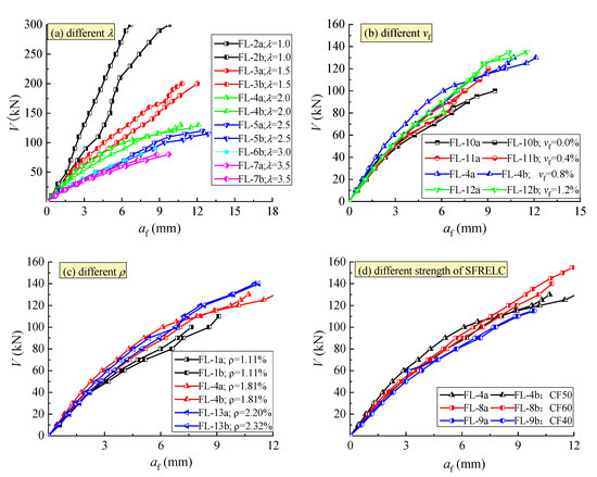 The curves of shear force V with mid-span deflection af of the test beams are exhibited in Figure 6. The inflection point on the curves was not clearly recognizable. However, the different slope appeared with an increasing load. With the increase of λ, as presented in Figure 6a, the mid-span deflection increased under the same shear force due to the increased flexural deformation with the increased bending moment at the mid-span section, and the beam action became a controlling role in the shear resistance [31,38]. With the increase of vf, as presented in Figure 6b, the mid-span deflection decreased under the same shear force due to the increase of the flexural stiffness of the mid-span section and the structural entirety of the shear-span [12,13,14,17], and the beam action tended to be improved. With the increase of ρ, as presented in Figure 6c, the mid-span deflection reduced due to the increasing dowel action of longitudinal reinforcement, especially at a high loading level. The strength of SFRELC had little influence on the change of mid-span deflection at a lower loading level, but an obvious benefit appeared at a high loading level (Figure 6d). This result is due to the enhancement of steel fibers for SFRELC with a good bonding properties, which promoted the interlocking action of aggregates along the rough concrete surfaces on each side of the crack, and enhanced the dowel action of the longitudinal reinforcement [36,37,38].