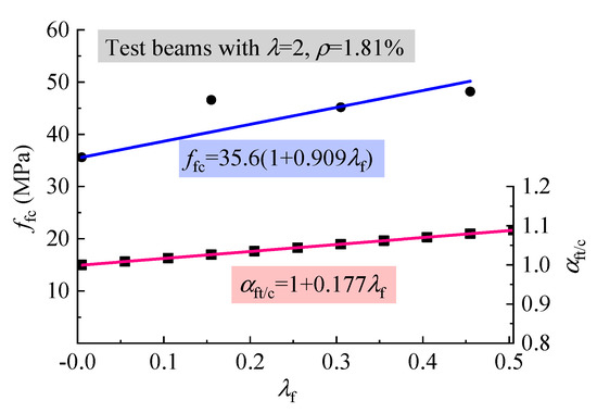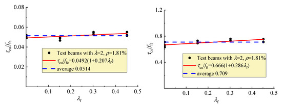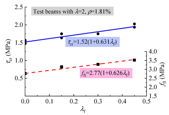 The fiber factor λf is usually used to represent the effect of steel fiber, which is the product of the aspect ratio lf/df with vf. Considering the respect ratio lf/df = 37.5 for the steel fiber used, the fiber factor λf = 37.5vf. The increase of τcr and fft with λf is exhibited in Figure 7. It can be seen from this figure that almost the same increment existed with the strengthening factor 0.631 and 0.626, respectively between τcr and fft with λf, in which 1.52 and 2.77 are the initial values of the average τcr and fft of the test beams and SFRELC without steel fibers. This indicates that the strengthening of the shear cracking relies on the increase of tensile strength of SFRELC, and τcr varies in direct proportion to fft. The same relationship was also obtained for reinforced SFRC beams without web reinforcement [39]. As the confinement effect of steel fibers on the micro-cracks in concrete improves the internal stress distribution of SFRELC at the shear span, and the concentrated stress at the micro-cracks is transferred farther by the successively distributed steel fibers [43], the shear cracking resistance of test beams can be promoted with the presence of steel fibers in SFRELC.