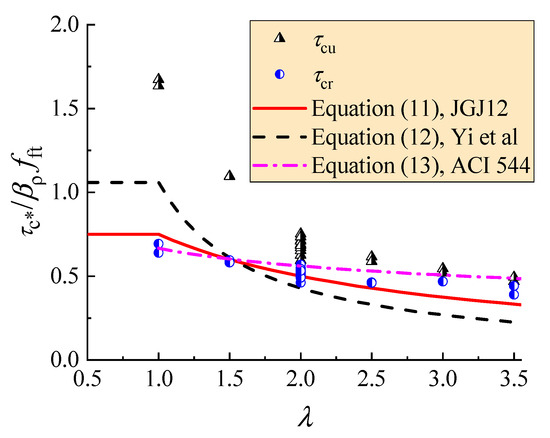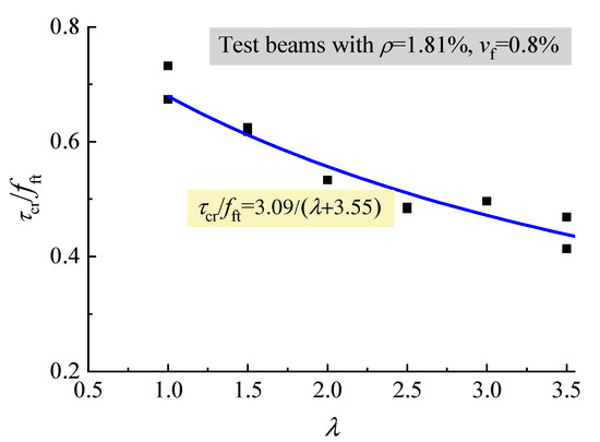 Figure 8 shows that the τcr decreased with the increase of λ. This result is due to the loading mechanism of reinforced concrete beams without web reinforcement no matter what kind of concrete is used [14,29,39].