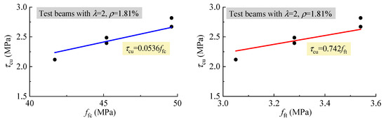 In this study, under the similar conditions of other influencing factors, the average ultimate shear stress τcu = Vcu/bh0 was in direct proportion to ffc and fft as presented in Figure 11, and linearly increased with ρ as presented in Figure 12. This indicates that the similar regularities exist between τcu and ρ, ffc, fft for the reinforced SFRELC beams compared to the reinforced conventional and lightweight concrete beams, as in previous reports [18,22,27,28,34].