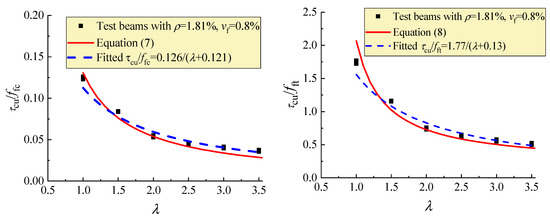 Meanwhile, the test results were further fitted by the formula proposed by Rebeiz [29] for the calculation of the shear-cracking force of reinforced concrete beams without web reinforcement: