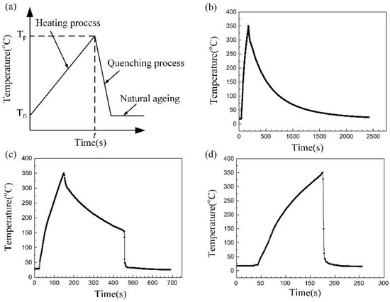 First, the specimens were heated in the furnace from room temperature to 350 °C, then quenched in different quenching medium immediately. Considering deformation, the structure is commonly heat straightened, then processed with air cooling for 5 min and subsequent mechanical rectification, finally followed by water quenching. We self-defined the acronyms to represent the various samples for convenience of discussion in this paper, the details of acronyms are shown in Table 2 and the corresponding schematic diagram of thermal cycles are displayed in Figure 1. The duration time from room temperature to 350 °C was arranged as around 120 s.