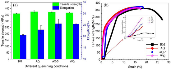 Tensile strength and elongation (a) and typical tensile stress-strain curves of heat-treated samples with different quenching conditions (b).