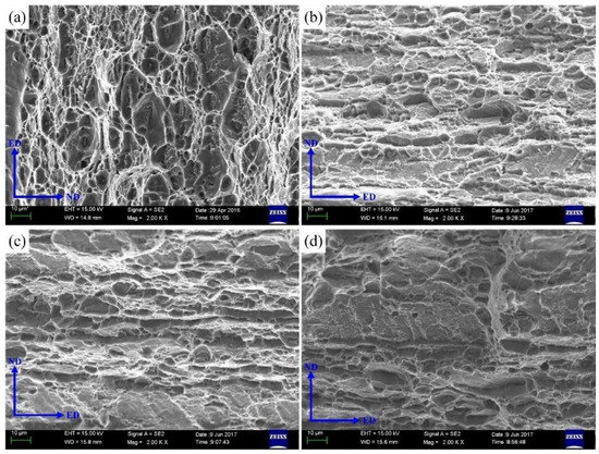 The fracture morphology of samples with different heat treatment process (a) BM, (b) AQ, (c)AQ-5 and (d)WQ (ED: extruding direction; ND: normal direction).