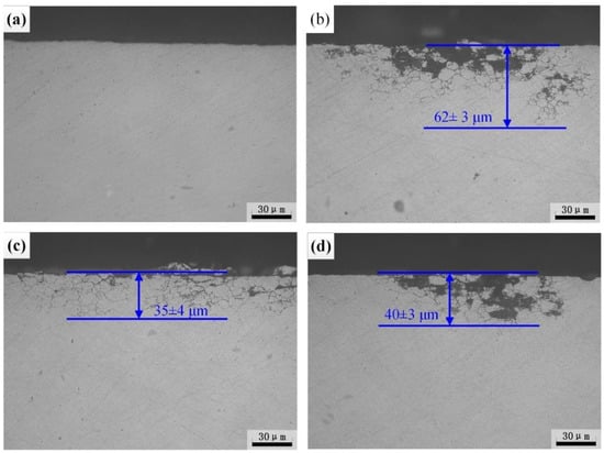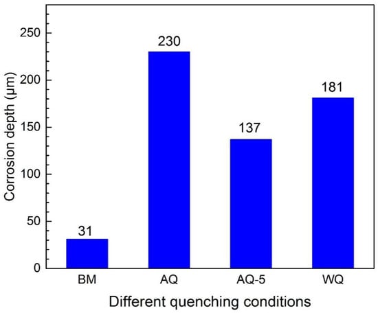 Heat treatable Al-Zn-Mg alloy with different quenching technology will result in the evolution of precipitates and then affect the corrosion behavior [3,30,31,32]. The IGC morphology of heat-treated specimens is displayed in Figure 5. After different heat treatment processes, the IGC depth of the specimen AQ is 62 μm, which is most susceptible to IGC. However, the sample AQ-5 displays the highest resistance to IGC with the corrosion depth of 35 μm, as displayed in Figure 5b,c, respectively. The intergranular corrosion depth of sample WQ is 40 μm. For the BM, no obvious IGC characteristics appeared. It is concluded that the susceptibility to IGC of Al-Zn-Mg alloy increases after NIHT with different quenching processes.